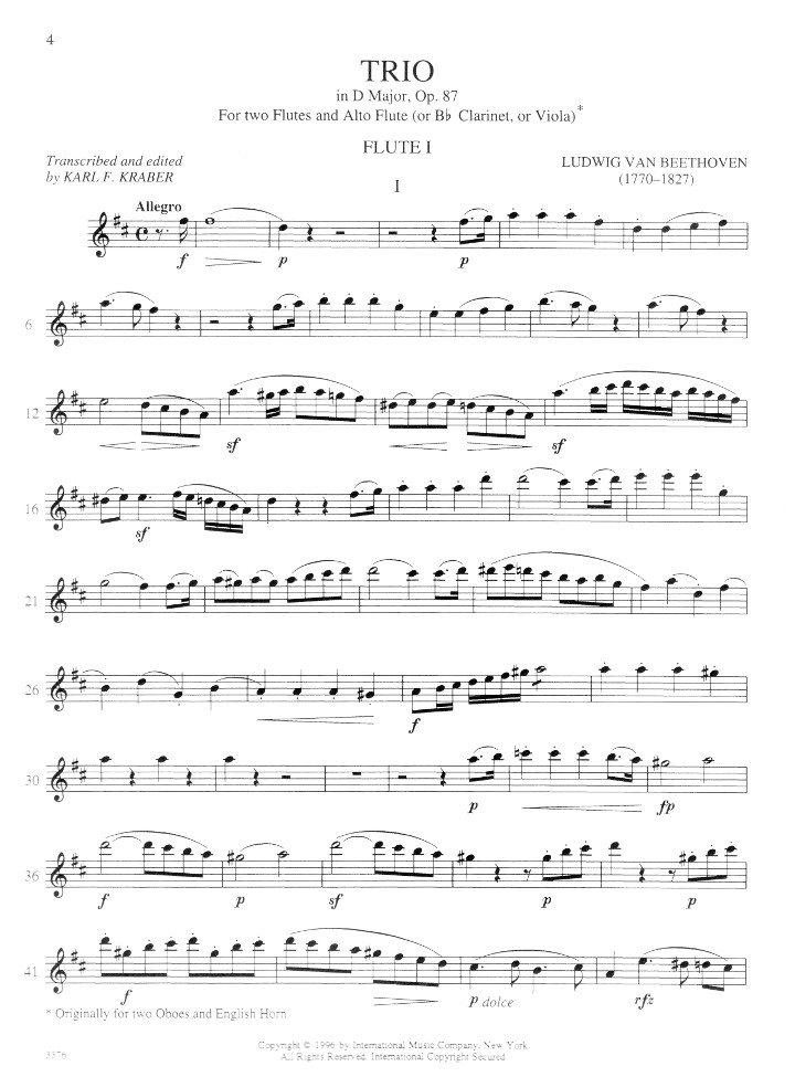 Prefatory note by the editor: 'Beethoven's Trio in C major for two oboes and English horn was composed in 1795 but was not published until 1806, by Artaria, as opus 87. In the same year Artaria also published a transcription for two violins and viola, for which Beethoven revised the first movement. Subsequent publications also appeared, including transcriptions for two violins and bass or bassoon (Simrock), two clarinets and bassoon (Simrock), violin and piano (Artaria), and, in D major, for two flutes and viola (Andre, Offenbach). This last was the basis of the present edition, which includes from it several changes from the original. The most notable of these are the division of the (original) first oboe part between the two flutes, and the embellishment of the English horn part (transcribed for viola, for which the anonymous editor added double stops and displaced many notes an octave lower) in measures 52-55 of the second movement.' - Karl F. Kraber