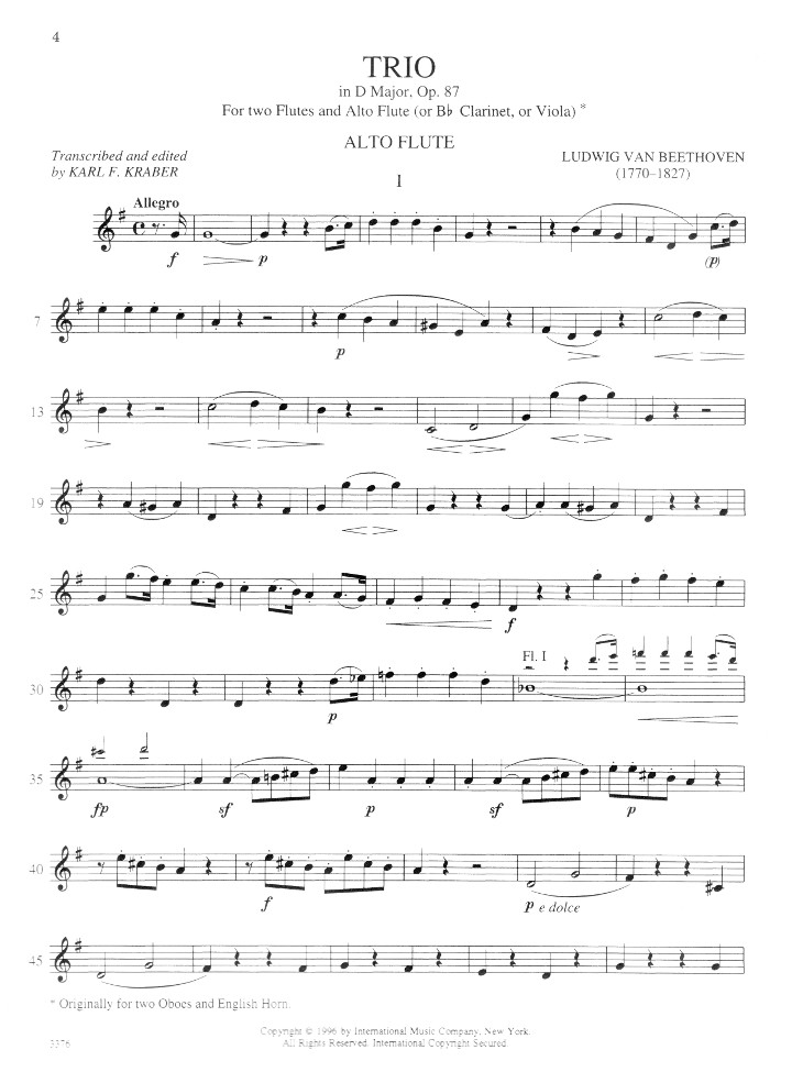 International Music Company presents Ludwig van Beethoven's Trio in D major, op. 87 edited for two flutes and alto flute (or B-flat clarinet, or viola) by Karl F. Kraber. Parts Only.