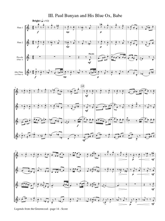Three Legends of North America: Hiawatha and the West Wind; Evangeline and Gabriel; Paul Bunyan and His Blue Ox, Babe. Three intriguing works for flute quartet, sure to add interest and variety to any program. 2001 NFA Newly Published Music Competition - Honorable Mention.