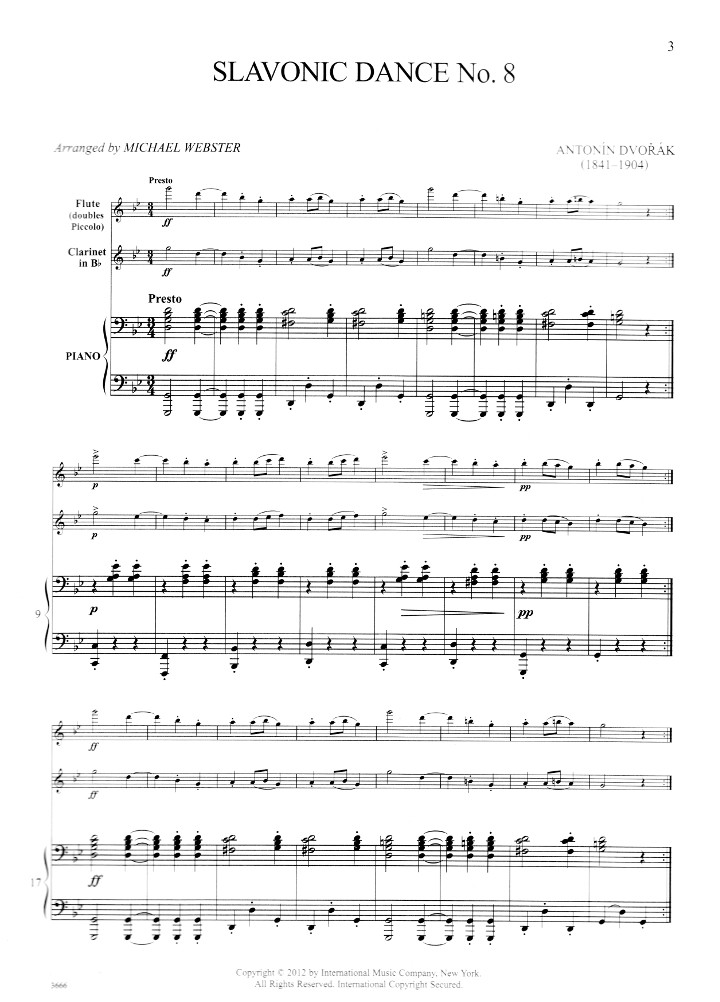 International Music Company presents Antonin Dvorak's 'Slavonic Dance Suite No. 1' arranged for flute (and piccolo), B-flat clarinet, and piano by Michael Webster.