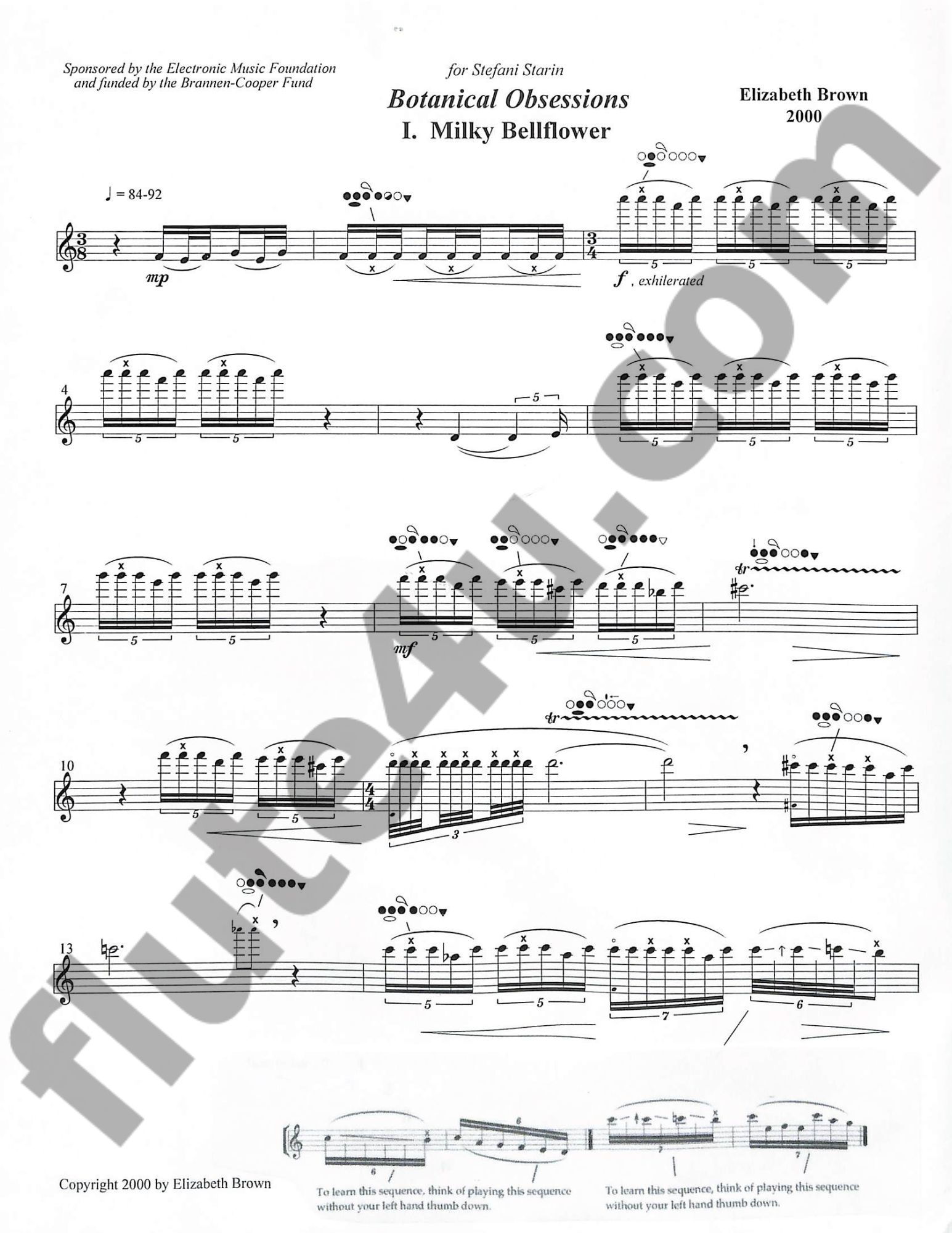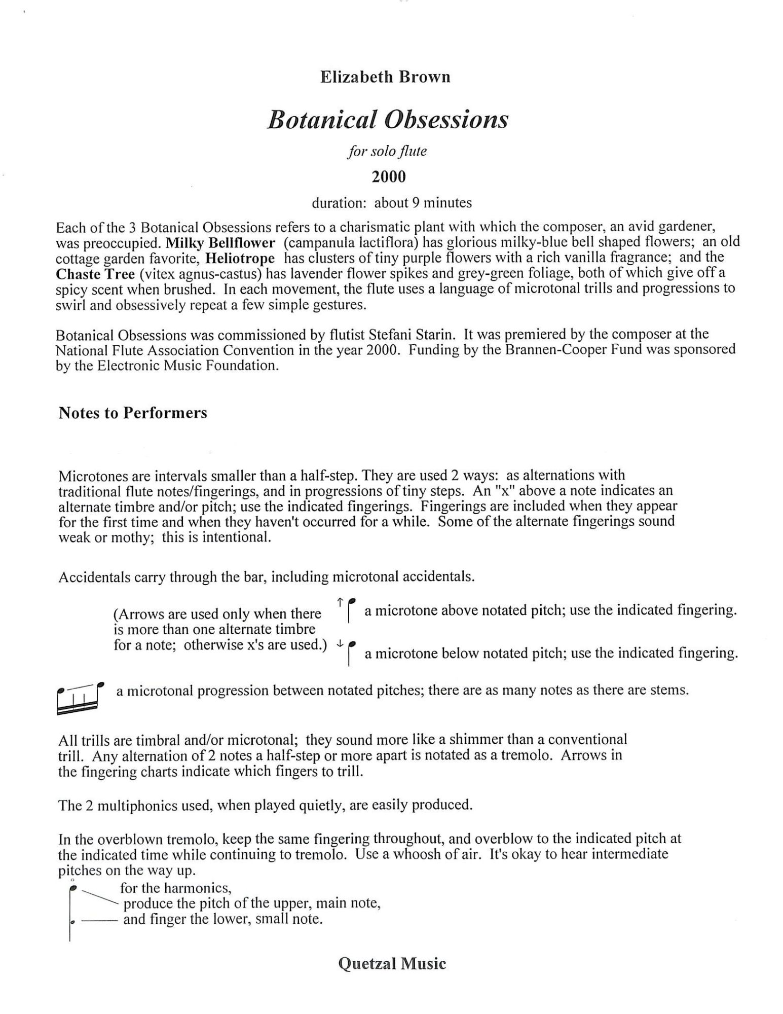 The composer writes about this piece: Each of the 3 Botanical Obsessions for solo flute refers to a charismatic plant with which the composer, an avid gardener, was preoccupied. Milky Bellfower (campanula lactiflora) has glorious milky-blue bell-shaped flowers; an old cottage garden favorite, Heliotrope has clusters of tiny purple flowers with a rich vanilla fragrance; and the Chaste Tree (vitex agnus-castus) has lavendar flower spikes and grey-green foliage, both of which give off a spicy scent when brushed. In each movement, the flute uses a language of microtonal trills and progressions to swirl and obsessively repeat a few simple gestures. Botanical Obsessions was commissioned by flutist Stefani Starin. It was premiered by the composer at the National Flute Association Convention in the year 2000. Funding by the Brannen-Cooper Fund was sponsored by the Electronic Music Foundation.