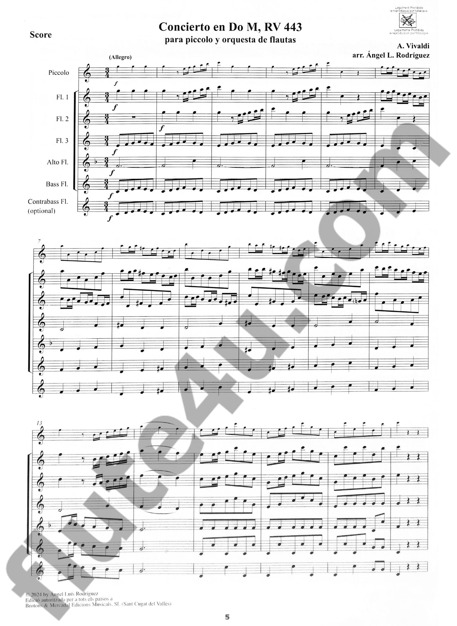 Brotons & Mercadal Edicions Musicals presents 'Concierto en Do M, RV 443 [Concerto in C Major].' It is arranged here for piccolo and flute choir by Angel Luis Rodriguez.