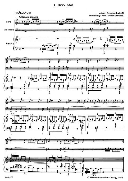 Barenreiter presents these extracts of Johann Sebastian Bach's Eight Little Preludes and Fugues, here including 553, 554, and 555 arranged for flute, cello, and piano.