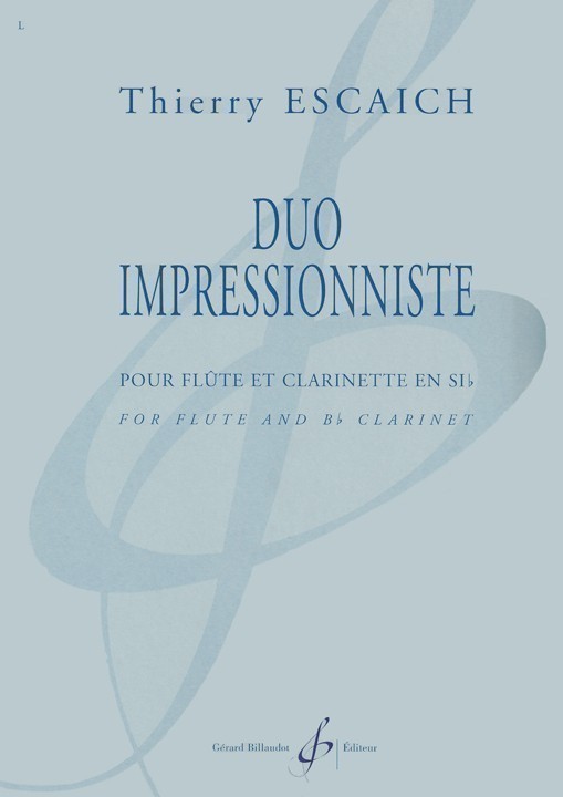 From the publisher, Gerard Billaudot, Thierry Escaich’s ‘Duo Impressionniste’ for flute and clarinet is an excellent choice for performers looking for a short work to perform as a stand alone or recital piece. Although this duo is just a minute in length, the texture is exquisitely interwoven between both voices. Escaich challenges both flutist and clarinetist to blend their sound, becoming one seamless voice. Some mixed meter appears briefly in this duo. Thierry Esciach is a prolific 21st Century French composer.