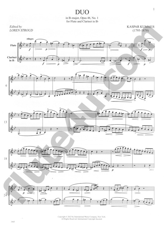 International Music Company presents composer Kaspar Kummer's 'Duo in B-flat Major, Opus 46, No. 1' for flute and clarinet in B-flat edited by Loren Stroud. A charming and elegant duo in three movements: Allegro, Andante poco Adagio, Allegro con moto. This edition includes both the parts and the score.
