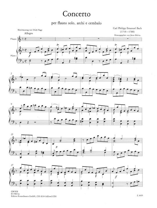 C.P.E. Bach's famous Concerto in D Minor, originally a harpsichord concerto but transcribed by Bach himself for flute, is presented here by Janos Malina and Edition Kunzelmann for flute and piano in a clean near-urtext edition with useful editorial markings and enough editorial comment to provide a solid basis of period interpretation.