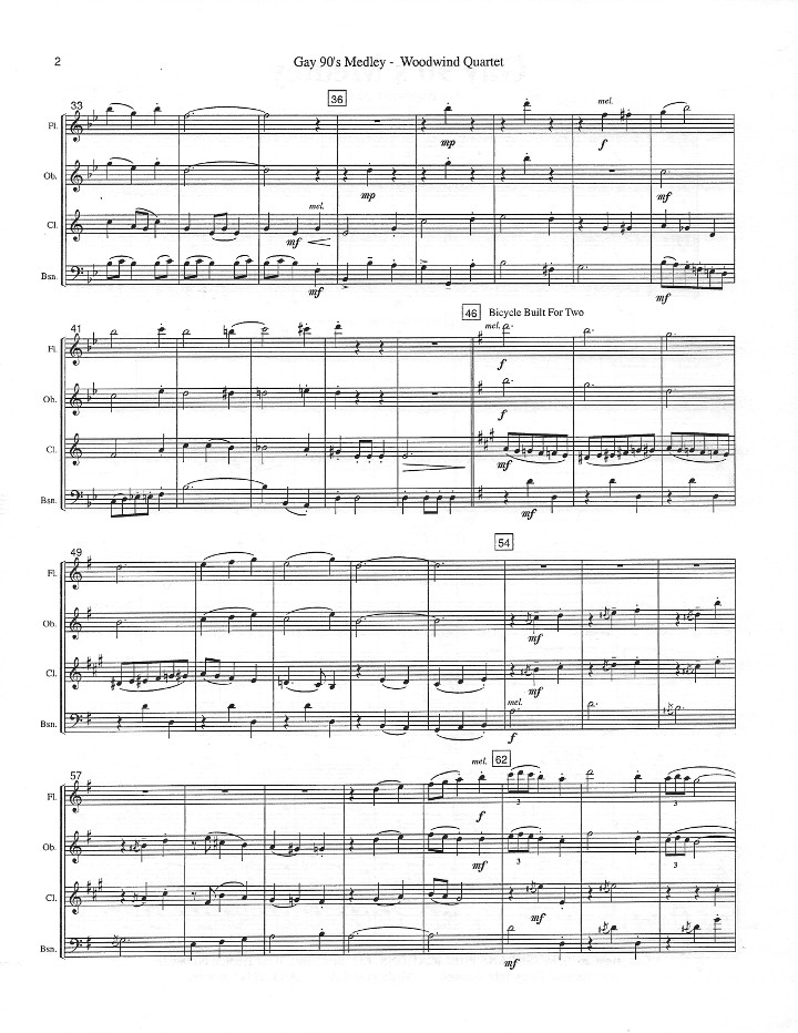 Musicians Publications presents Gay 90 s Medley by Bill Holcombe and arranged for flexible woodwind quartet by Bill Holcombe Jr. Scored for flute, oboe, clarinet, and bassoon, this flexible quartet also includes an optional bass clarinet part to replace the bassoon when necessary. This arrangement is intermediate in difficulty.