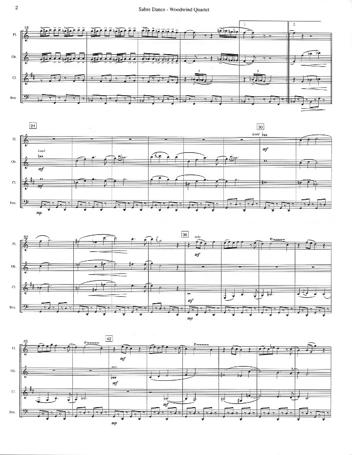 Musicians Publications presents Aram Khachaturian s Sabre Dance from his ballet, Gayne arranged for woodwind quartet by Bill Holcombe Jr. Scored for flute, oboe, clarinet, and bassoon, this flexible quartet also includes an optional bass clarinet part to replace the bassoon when necessary. This arrangement is advanced in difficulty.