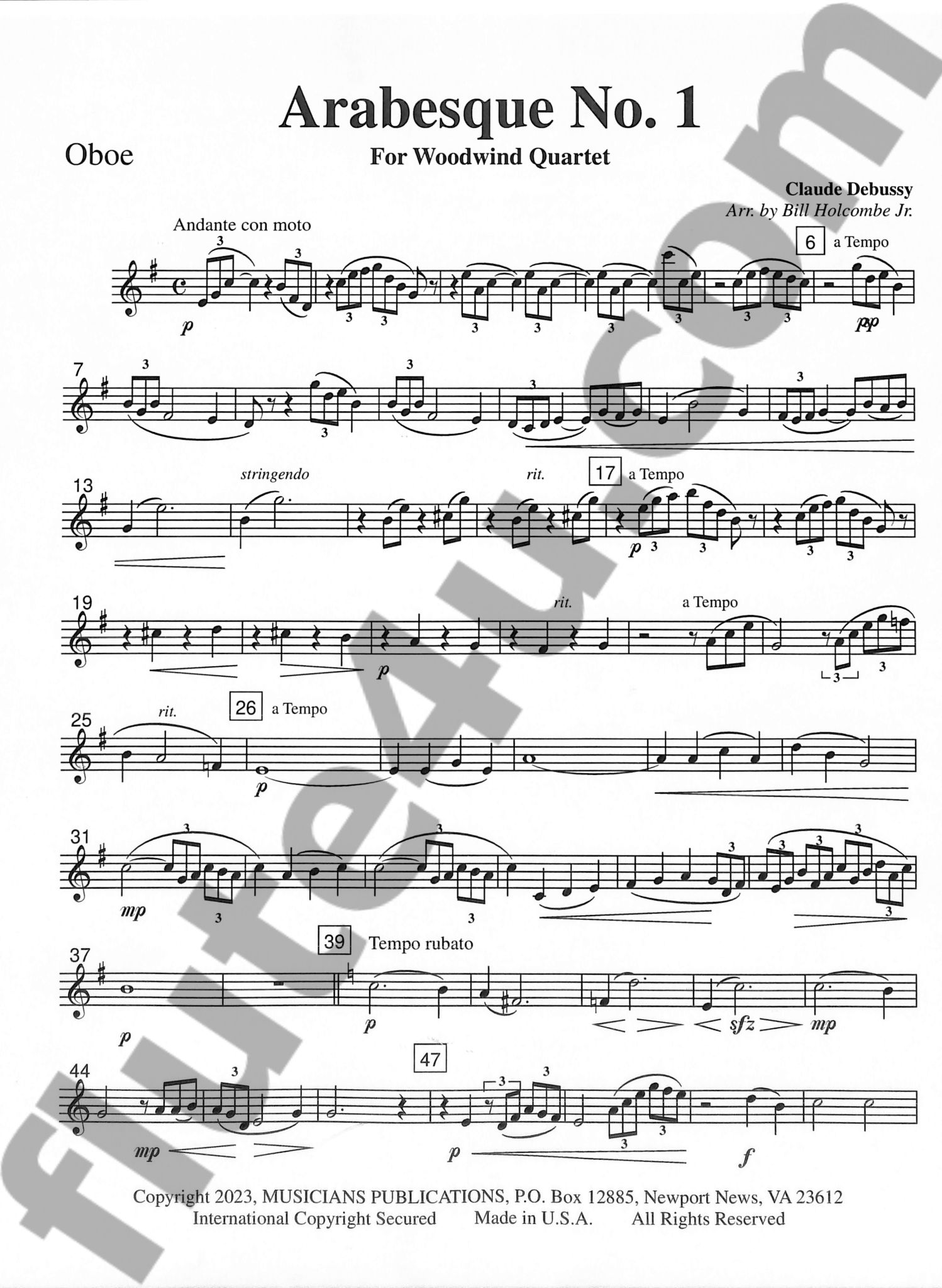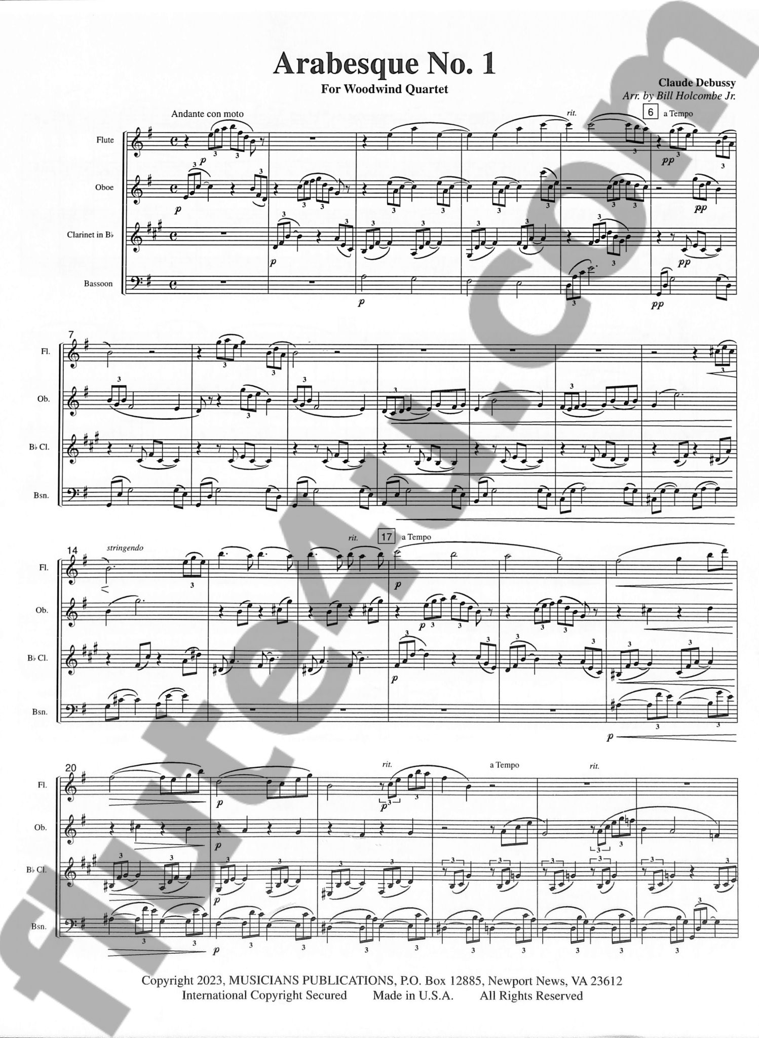 Musicians Publications presents composer Claud Debussy's Arabesque No. 1 arranged for woodwind quartet by Bill Holcombe Jr. Scored for flute, oboe, clarinet, and bassoon, this edition also includes a bass clarinet part to substitute for the bassoon if desired.