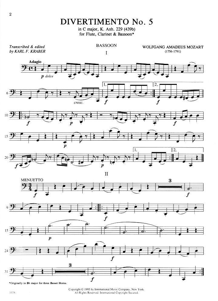 International Music Company presents Amadeus Mozart's Divertimento No. 5 in C Major, K. 229 (439b) for Flute, Clarinet and Bassoon (parts only) edited by Karl F. Kraber.